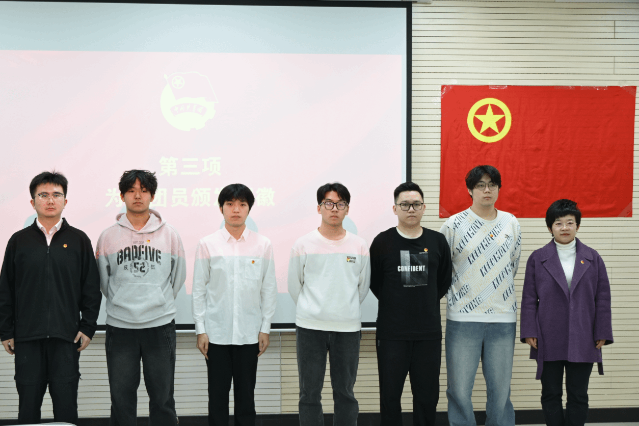 团徽颁发环节,杜瑶、付强为新团员逐一佩戴团徽。佩戴好崭新的团徽后,18名新团员在领誓人徐心悦的带领下,高举右拳、面向团旗庄严宣誓,铿锵有力的誓言,彰显着新时代青年的使命与担当,激荡着青春的梦想与朝气。