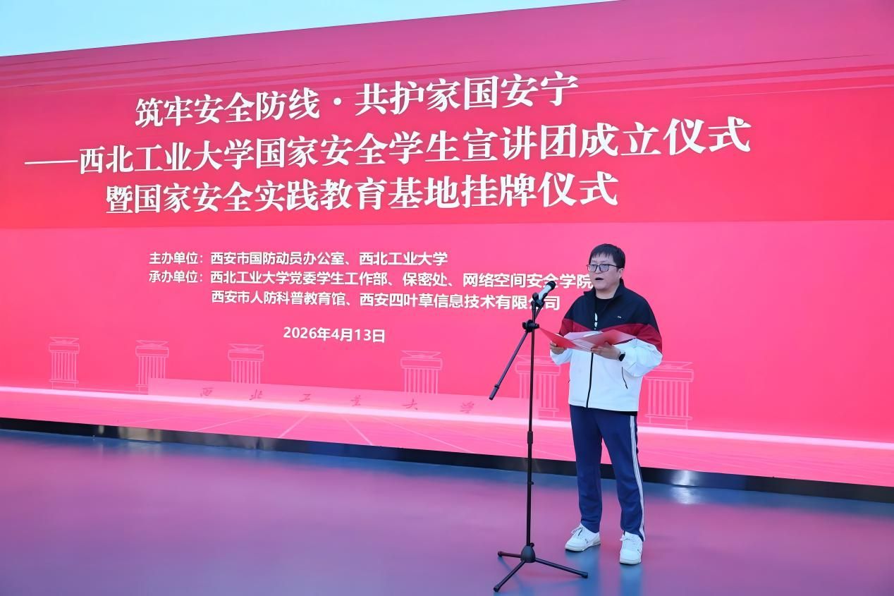 、西安市人防科普教育馆、西安四叶草信息技术有限公司共同承办的“筑牢安全防线·共护家国安宁——西北工业大学国家安全学生宣讲团成立仪式暨国家安全实践教育基地揭牌仪式”,在西安市人防科普教育馆举行。