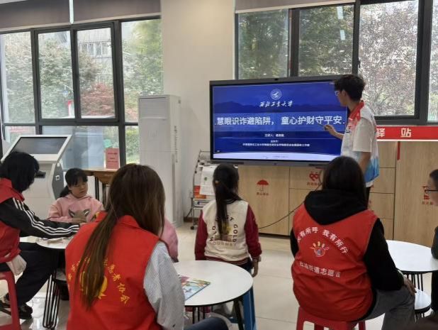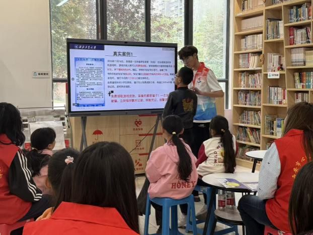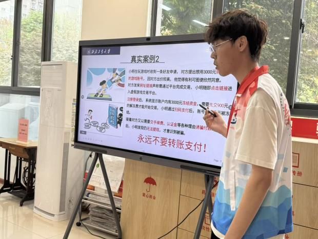 2024级本科生谢忠航以生动易懂的方式,为社区小学生带来反诈安全课堂。他结合小学生日常网络场景,拆解了游戏免费皮肤、校园扫码领礼品、追星门票、快递理赔等常见诈骗陷阱,揭示“免费”“优惠”背后的诈骗套路,提醒孩子们警惕个人信息泄露和转账风险。