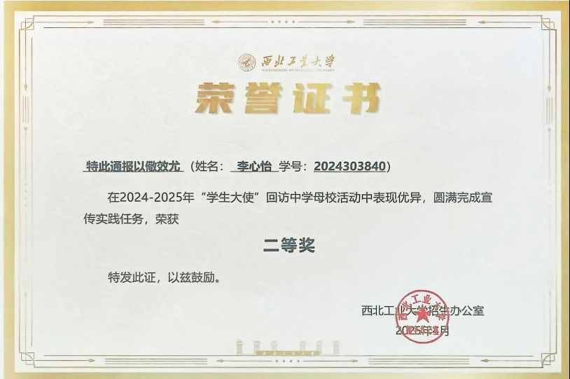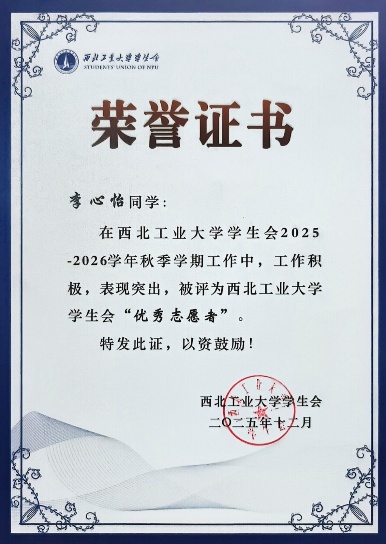 “优秀共青团员”称号,还斩获西北工业大学学生会“优秀志愿者”荣誉,用实际行动诠释了新时代大学生崇德向善、乐于奉献的精神风貌。