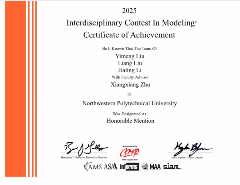科研竞赛中他不畏困难,自主承担了数学建模美赛的编程工作,首次尝试就获得了H奖的成绩。在数学建模国赛中,获得了省级二等奖的荣誉。他主持了基于图注意力神经网络的社交机器人检测研究的省级大学生创新创业训练项目,带领队员们与老师积极交流,为网络安全领域社交机器人识别提供新思路。